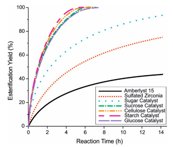 Lou et al. [10] prepared and compared four carbohydrate-derived catalysts from D-glucose, sucrose, cellulose and starch. The preparation method was as the same as that by Zong et al. [46] except carbonisation was carried out at 400 °C rather than 450 °C. The esterification of oleic acid was used to evaluate the catalytic activity of the four catalysts. Each catalyst was added to a methanol oleic acid mixture, with a 10:1 molar ratio, and reacted at 80 °C. After 3 h, the starch, cellulose, sucrose and D-glucose catalysts had achieved a conversion of 95%, 88%, 80% and 76%, respectively. Figure 4 clearly indicates that the catalyst derived from starch was much more active for the esterification reaction than the other three catalysts. A yield of 95% was achieved in under 3 h whereas the cellulose, D-glucose and sucrose catalysts required 4–5 h to achieve a comparable yield.