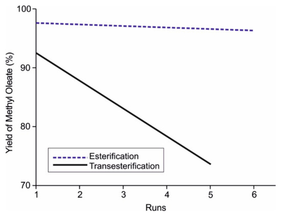 Hara [41] also investigated the ability of the catalyst to catalyse the transesterification reaction; the cellulose catalyst was used to catalyse the transesterification of triolein to methyl oleate in the presence of methanol. A conversion of > 98% was achieved; the catalyst demonstrated good reusability over five runs for the transesterification reaction, presented in Figure 5.