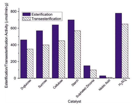 Despite the inferior surface area of the carbohydrate-derived catalysts in comparison with the sulphated zirconia and niobic acid, the four prepared catalysts exhibited much higher esterification and transesterification activity. The starch catalyst in particular had an esterification and transesterification activity comparable to that of the concentrated H2SO4 (Figure 6).