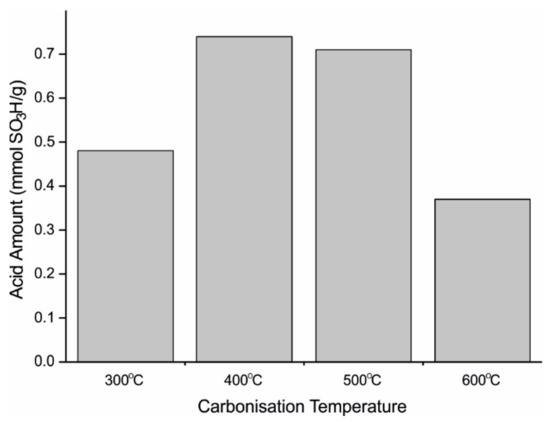 Okamura et al. [40] completed a study on the effect of carbonisation temperature on the catalytic ability of a D-glucose catalyst. The D-glucose was carbonised at 300, 400, 500 and 600 °C. The acid content due to SO3H (which is representative of the catalytic performance) of the four D-glucose was compared, and the results are shown in Figure 8.