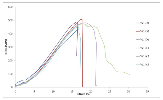 - In Figure 6, the stress–strain curves of the W1-K and W1-D specimens were basically identical before failure. It indicated that the load carried by the three-layer spar cap specimen repaired using a double stepped-lap scarf joint was basically consistent with the blade strength status of running for several years. The stress–strain curve of the W1-K specimen had an obvious nonlinear unloading section after failure, which was related to different degrees of stiffness attenuation after the specimen had been running for a certain number of years. It was indicated that there would be a serious performance degradation of the structural material after several years of operation.