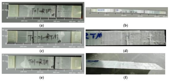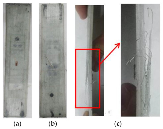 - At each loading stage of the fatigue test, the change rate of the sensor residual resistance on the left side of the specimen was generally lower than that on the right side. Until fatigue failure, the change rate of the residual resistance of the sensor on the left reached 0.25 at most, while the sensor on the right failed completely. It could be inferred that the right sensor’s stepped-lap joint surface was completely delaminated. This was consistent with the development results after the failure of the fatigue specimen (Figure 18), which indicated that the carbon nanotube buckypaper sensor could accurately detect the progressive damage of the stepped-lap scarf joint repaired unidirectional tape specimen.