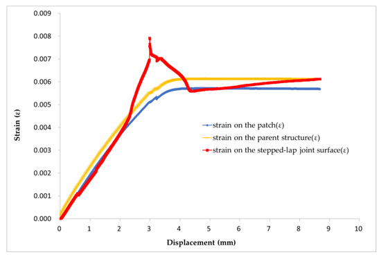 - In Figure 8, the strain of the stepped-lap joint surface increased rapidly in the rising section, then fell rapidly, which indicated that a certain damage had occurred there, while no strain agitation occurred in the patch and parent structure. Therefore, the initial damage failure position of the specimen was located at the stepped-lap joint surface.