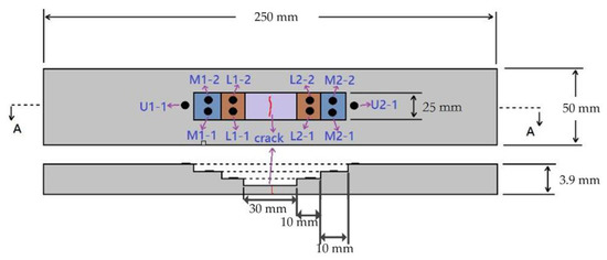 - When the number of fatigue cycles of all sensors was at around 30,000–45,000 cycles, irregular fluctuations occurred, as shown in Figure 17. The crack was in the accelerated propagation during this time, and the L2-1 and L2-2 sensors fluctuated violently. This indicated that the crack was near the monitoring area of L2-1 and L2-2.