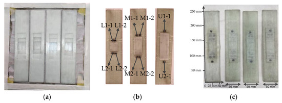 - The failure specimens for the tensile test of the one stepped-lap joint surface and three stepped-lap joint surfaces are shown in Figure 7, where all specimens failed on the stepped-lap joint surface. The initial failure mode of the stepped-lap joint surface appeared as delamination. The final failure of the specimens was characterized by the coupling mode of the shear failure of the adhesive layer and the fiber fracture on the stepped-lap joint surface.