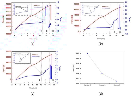 - As the load increased, the sensor resistance increased dramatically and dropped suddenly, where point C was the sensor resistance’s drop point, the load effect was about 63 kN, and the B–C state segment was the damage evolution inside the structure. When reaching point C, the internal structure of the specimen formed an initial crack, the stress was suddenly released, and the whole structure of the specimen had not reached the failure level. When further increasing the load, after point C, the resistance of the sensor dropped suddenly.