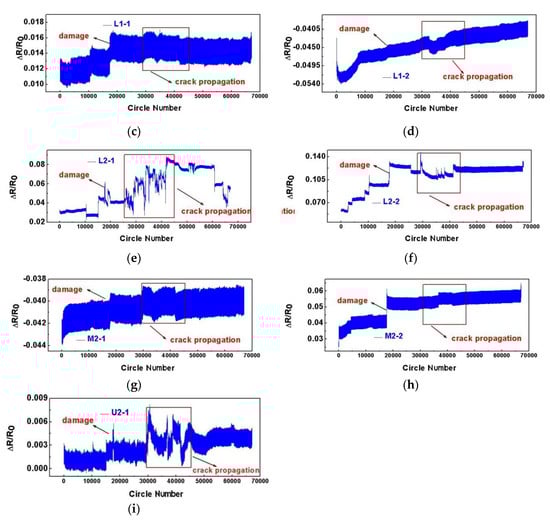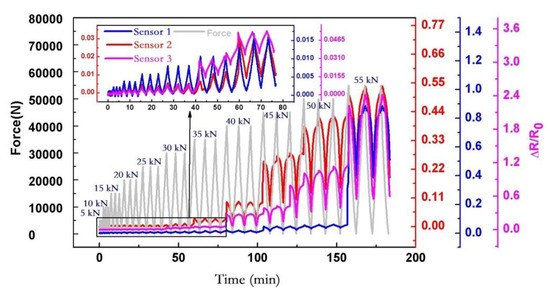 - Figure 17 showed the response results of 60,000 fatigue tests with a 10–20 kN load. When the fatigue cycle of all the sensors reached about 18,000, the resistance response of all the sensors presented different degrees of steps. It indicated that the specimen suffered serious structural damage at this moment, which could affect the response of all the sensors on the specimen.