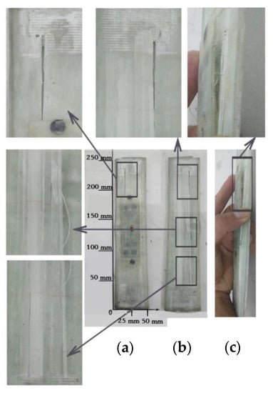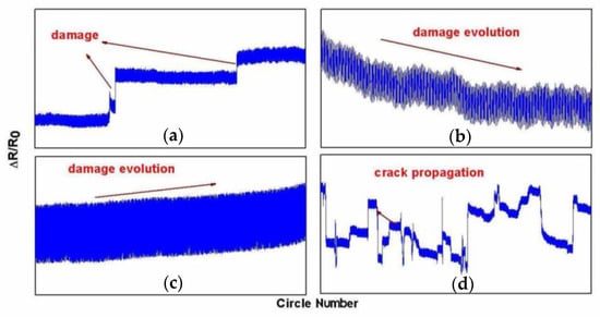 - During the whole fatigue cycle test, the response of the sensor could mainly represent four kinds of structural status of the specimen: the response of the sensor when the damage was derived, as shown in Figure 16a; the response of stiffness degradation when the damage was accumulated, as shown in Figure 16b,c; and the response of the initial crack and crack propagation, as shown in Figure 16d.