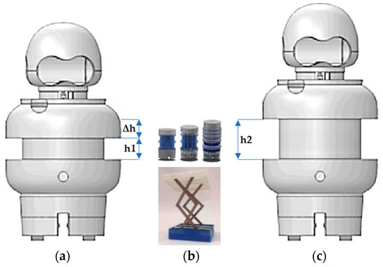 Robot growth implementation: (a) height from h1 and intent of extension of Δh (b) implementation of Δh with wrinkled tube including scissor jack structured inside and (c) after the physical growth of Δh up to h2.