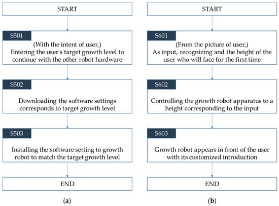 On the other side, Figure 9b is a flowchart showing a method of controlling the keys of the growth robot apparatus by the control terminal. The control terminal can recognize the height of a person from the prepared picture of the user (S601). Then, the control terminal can operate the lifting apparatus provided in the growth robot apparatus to correspond to the height input (S602). Then the growth robot can introduce itself with the customized settled height in front of the user (S603).