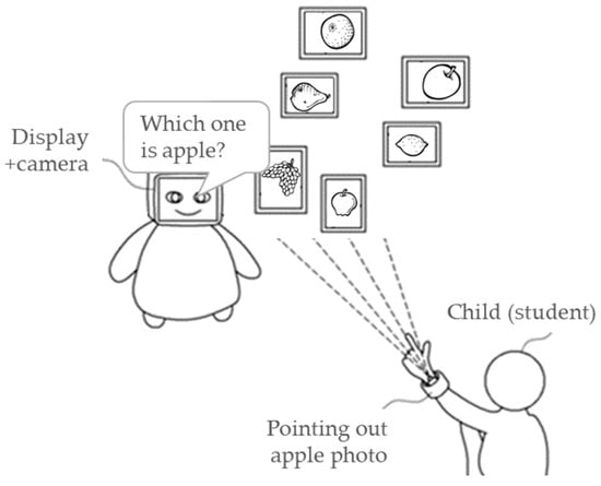 The growth robot apparatus can ask a person a question and can detect a person’s behavior on a question. That is, the growth robot apparatus can ask a person about a name of an object, recognize a person’s answer to a question, and recognize a person’s expression or movement through a camera [21]. The following Figure 11 describes a situation of a growth robot apparatus with the embodiment of the present invention [22] interacting with a child user which previously appeared in Figure 6, Figure 7, Figure 8, Figure 9 and Figure 10.