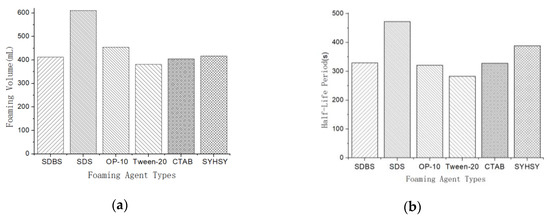 Effects of the different foaming agents on the foam volume and half-life period of the modified CGAs: (a) foam volume; (b) half-life period.