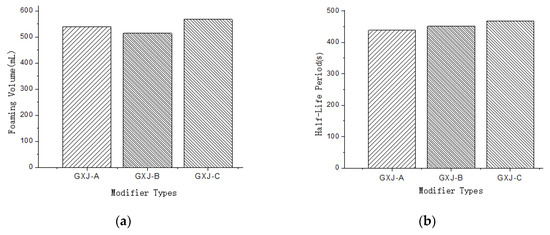 Effect of the different modifiers on the foam volume and half-life period of the modified CGAs: (a) foam volume; (b) half-life period.