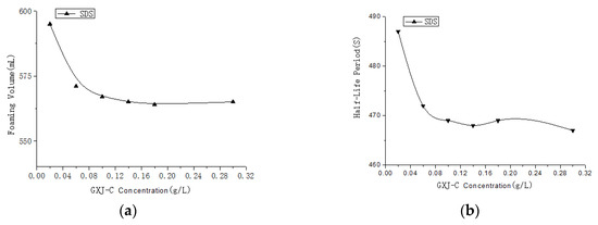 Effect of the different concentrations on the foam volume and half-life period of the modified CGAs: (a) foam volume and (b) half-life period.