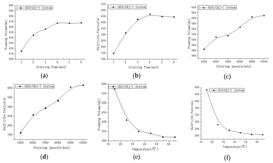 Effect of the different preparation conditions on the foaming volume and half-life period of the modified CGAs: (a) effect of the stirring time on the foam volume; (b) effect of the stirring time on the half-life period; (c) effect of the stirring speed on the foam volume; (d) effect of the stirring speed on the half-life period; (e) effect of the preparation temperature on the foam volume; (f) effect of the preparation temperature on the half-life period.