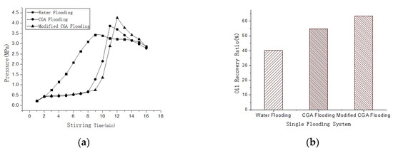 Water flooding, CGA foam flooding, and modified CGA foam flooding were carried out on three sandpack cylinders with similar permeability and oil saturation values (V = 9.5 mL/min). The injection pressure and recovery results are shown in Figure 6.