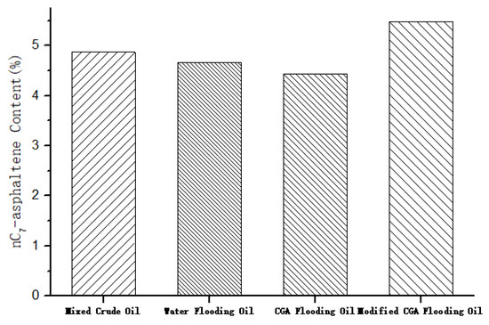 Figure 7 shows the asphaltene content data of the crude oil with different system gradient displacements. The figure reveals that the asphaltene content in the oil recovered by water flooding was 4.66%, and that the asphaltene content in the oil recovered by CGA flooding was slightly lower, at 4.44%. However, the asphaltene content in the oil recovered by modified CGA flooding was 5.48%. Compared with the asphaltene content in the mixed crude oil of 4.87%, the changes in asphaltene content in the oil recovered by water flooding, CGA flooding, and modified CGA flooding were −4.31%, −8.83%, and +12.53%, respectively. As the modifier is a crude oil fraction, which is miscible with crude oil, the modified CGA system formed by adding GXJ to CGAs as a modifier clearly reduced the interfacial tension and played a role in dissolving the heavy components in crude oil.