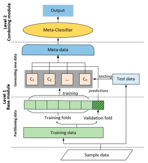 The metadata generation methods of the stacking model include bootstrap, bagging, and cross-validation. As shown in Figure 2, in this study, we selected the -fold cross-validation method.