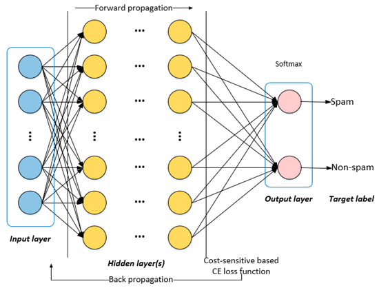 In this study, we use cost-sensitive modified cross entropy as the loss function during classifier training. This paper mainly focuses on spam detection, and therefore we pay more attention to the spam class than to the non-spam class. Thus, should be larger than , forcing the error classification cost for spam samples to be higher. The overall error of the cost-sensitive DNN can be formulized as follows: