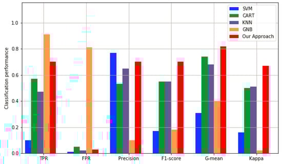 Figure 4 presents the classification performance of each method in terms of TPR, FPR, precision, F1-score, G-mean, and Kappa. The histogram chart illustrates that only the CART method and our method have stable metrics; the other methods have large fluctuations. For example, the precision of SVM is 0.77, but its TPR is 0.10, F1-score is 0.18, and its Kappa is 0.16, which means that the method is highly influenced by the majority class, and the classification results tend toward non-spam. The TPR, precision, F1-score, and Kappa of CART method show stable performance within the range 0.50–0.57, but these values are lower than those of our approach.