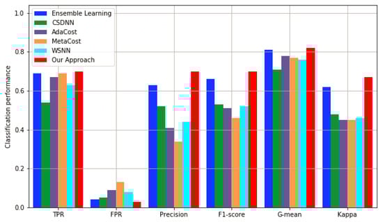 Figure 5 intuitively illustrates an experimental comparison between our proposed method and the improved methods. Considering the MetaCost method as an example, the TPR of this method is 0.69, which is very close to the 0.70 achieved by our method, but its accuracy, F1-score, and Kappa are 0.3, 0.19, and 0.22 lower than those of our method. This phenomenon indicates that although the method obtains a better positive sample recognition rate, it also misclassifies a large number of negative samples. In the same way, the ensemble learning method achieved good results in this group of experiments, but its accuracy and F1-score are 7% and 4% lower than that of our method, and its Kappa is 5% lower. Therefore, our method yields good performances as compared with those of other improved methods.