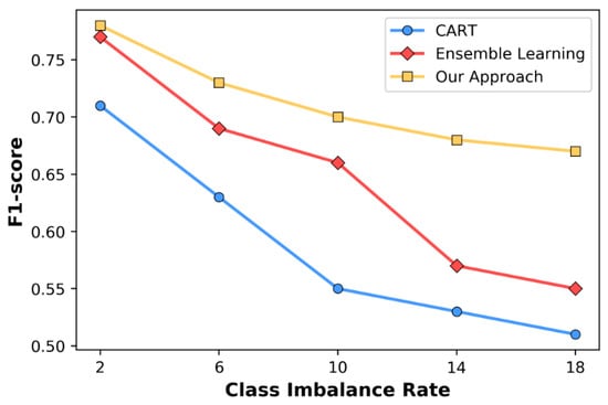 As shown in Figure 6, as the class imbalance rate increases, the F1-score of these three methods gradually decreases. For the ensemble learning method, when IR = 2, its F1 result is 77%, but its F1 value drops to approximately 55% as the IR increases to 18, causing an overall decline of 22%. The second method, CART, fell by 20%, i.e., from 71% to 51%. Our method also shows a downward trend as the imbalance rate increases from 78% when IR = 2 to 67% with IR = 18, but compared with the other methods, this downward trend is relatively gentle. For example, our method achieves the best F1 value (78% when IR = 2). As IR increases to 10, our result is 70%, the result of ensemble learning is 66%, and CART falls to 55%. When the class imbalance rate increases to 18, the F1-score of our method is 67%, which is only 3% lower than when IR = 10, but CART and ensemble learning methods are 4% and 11% lower, respectively. Finally, the comparison shows that our method maintains relatively stable overall performances with different class imbalance rates, and therefore it shows better robustness.