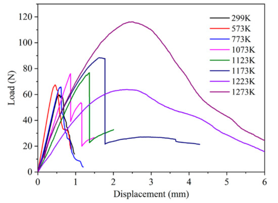 Figure 3 only shows the eight typical load–displacement curves of the CT specimens at various experiment temperatures. When the temperature was below 1173 K, the typical brittle fracture mode of the specimen was seen from the load–displacement curves. At 1223 and 1273 K, the softening phenomenon of the specimen was clearly observed. For example, two of the load–displacement curves both contained a nonlinear region before the load peak reached the peak, induced by crack tip blunting, caused by the viscous flow deformation of the fibers and the bonding between the fibers [25]. When the load reached the peak, the load gradually decreased. The millimeter scale crack tip blunting needed to dissipate the extensive energy absorption. Then, the crack caused by the fiber failure initiated from the blunting region. In addition, the similar crack tip blunting deformation of the specimen, at various temperatures, is observed in [25]. For example, using the SEM images of the crack tip of the CT specimens, with a porosity of 89% at different temperatures, we see that the crack tip sizes almost kept constant, and without crack tip blunting deformation, from 299 K to 773 K. After 773 K, the crack tip blunting was obvious, based on the remarkable residual crack sizes of the CT specimens. Those morphological characteristics of the crack tips are similar with CT specimens with a porosity of 87%. In this work, the fracture toughness JC was calculated by [13].