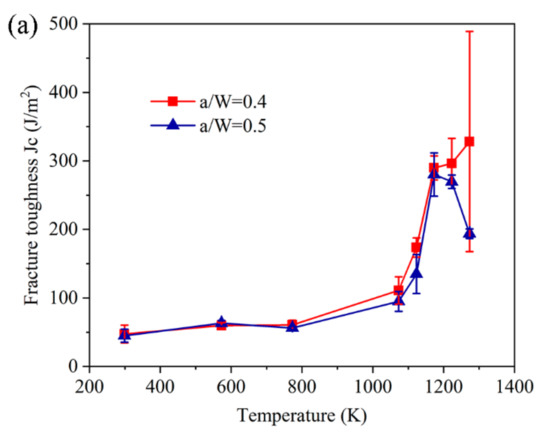 - The experimental observations revealed that the fracture toughness JC along the TTT direction of the 3D RF materials, with a crack length-to-width ratio of 0.4, increased by approximately 574% (from 47.32 to 328.28 J/m2) from 299 to 1273K and, when the ratio was 0.5, it increased from 44.92 to 280.09 J/m2 (by approximately 524%) from 299 to 1173 K;
