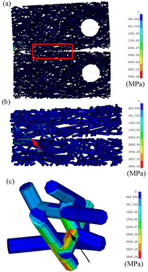 Principal stress contours of (a) the FE model with a ratio of 0.5 (the tensile displacement was 0.4 mm), (b) the stress contours of the sliced FE model from the red rectangle in (a), and (c) the stress contours of the local structure from the red arrow in (b).