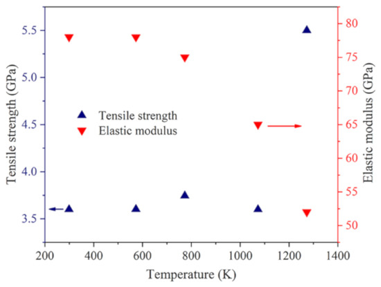 We showed in our previous study that the elastic modulus of the fibers continuously decreases from 299 to 1273 K [31]. However, the fracture strength of the fibers is hard to determine at elevated temperatures. Using this FE model and the elastic modulus of fibers, we predicted the fracture strength at elevated temperatures based on the predicting process in Figure S3 of the Supplementary Material. Additionally, the predicted tensile strength is plotted in Figure 11. Clearly, the fiber strength almost kept constant from 299 to 1073 K (~3600 MPa), and exhibited a sharp increasing trend as the temperature increased from 1073 to 1273 K (from ~3600 to ~5500 MPa). However, the elastic modulus exhibited a continuous decreasing trend from 299 to 1273 K (from ~78 to ~52 GPa). As shown in Figure 10, the simulated curves of the fracture toughness JC vs. the temperature fitted well with the experimental observations. In fact, such a good fit cannot be obtained when the strength of the silica fibers, as well as the bonding between the fibers, continuously decreases with the increase in temperature. At an elevated temperature, the fibers, and the bonding between the fibers, usually softened and the crack tip of the CT specimen blunted. Therefore, more work is needed to stretch these fibers in this 3D RF material. This phenomenon can also be verified in the typical load–displacement curves from the CT specimen experiments at elevated temperatures (Figure 3).