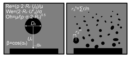 The initial surface area of a drop before impact S0 was given by S0 = 4·π·Rd2 and the volume of such a drop, by V0 = 4/3·π·Rd3. The surface area and volumes of child droplets were given by Si = 4·π·ri2 and Vi = 4/3·π·ri 3, respectively. A total surface area of the child droplets S and their total volume were expressed as a sum of the surface areas of all child droplets and their volumes, respectively.
