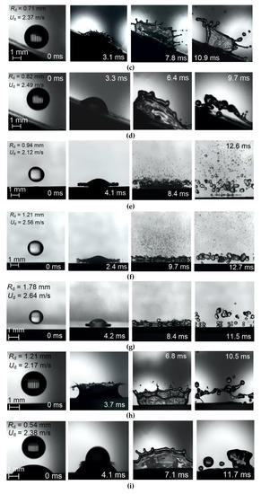 Figure 6 shows how the impact regimes vary if we use a fine-meshed screen and a substrate made of various materials. Based on experimental results [6,7,8,9], we formulated an assumption that the fine-meshed screen allowed an increase in the number of small child droplets. When a drop impinged on the screen, dumbbell-shaped child droplets emerged. The liquid surface area grew by 2.2 times (Figure 6b). However, the impact on a solid surface could provide better drop atomization at the same We. In particular, if the screen is used, the size of child droplets could reach 350–500 μm (Figure 6c). If the cellular construction size is assumed even smaller, the falling drop will disintegrate more slowly and into larger fragments because the pressure will be insufficient to squeeze the liquid out of the mesh.
