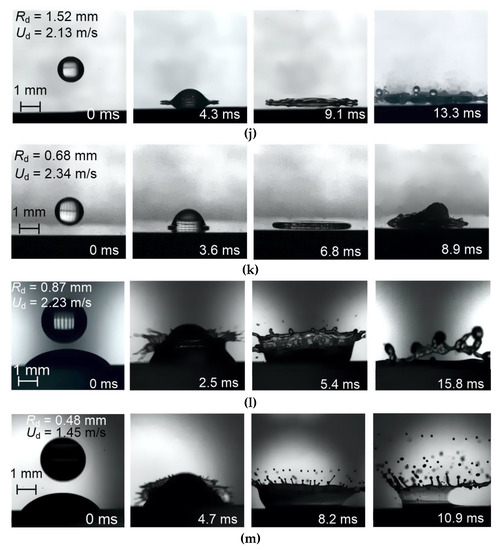 Snapshots of the drop impact on the wall: (a) water; (b) water; (c) water, impingement angle αd ≈ 60°; (d) water, impingement angle αd ≈ 30°; (e) water, surface with a temperature of T ≈ 50 °C; (f) water, surface with a temperature of T ≈ 100 °C; (g) water, surface with a temperature of T ≈ 180 °C; (h) metal surface (Ra = 20; 16; 10 μm; Rz = 80; 63; 50; 40 μm); (i) water, surface is covered by the transformer oil; (j) water, surface is covered by paraffin; (k) emulsion (30 vol.% of the transformer oil, 70 vol.% of water); (l) emulsion (30 vol.% of the castor oil, 70 vol.% of water); (m) slurry (30 wt% of coal, 70 wt% of water).