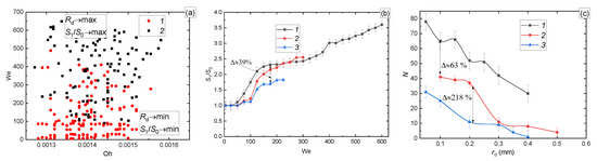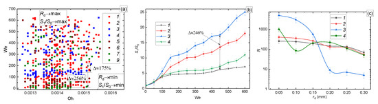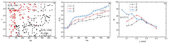 (a) Regime map of the drop impact on the surface as a function of We(Oh): 1—deposition of the first drop and coalescence with all others; 2—breakup; (b) S1/S0(We); (c) size distribution of the child droplets at We = 200 and with different sizes of the parent drop: 1—Rd = 2–2.7 mm; 2—Rd = 1–2 mm; 3—Rd = 0.5–1 mm.