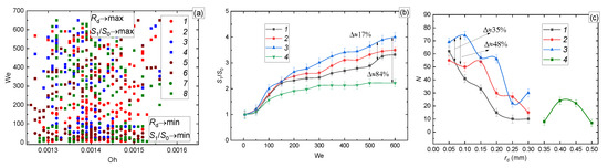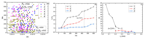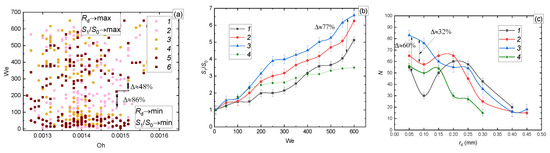 (a) Regime map of the drop impact on the wall (circle—deposition of the first drop and coalescence with all others, square—breakup) as a function of We(Oh): 1, 2—Ra = 0.01; 0.008 μm; Rz = 0.05; 0.04; 0.032 μm; 3, 4—Ra = 2.5; 1.25 μm; Rz = 10; 8; 6.3 μm; 5, 6—Ra = 20; 16;10 μm; Rz = 80; 63; 50; 40 μm; (b) S1/S0(We); (c) size distribution of child droplets at different surface roughness: 1—Ra = 0.01; 0.008 μm; Rz = 0.05; 0.04; 0.032 μm; 2—Ra = 2.5; 1.25 μm; Rz = 10; 8; 6.3 μm; 3—Ra = 20; 16;10 μm; Rz = 80; 63; 50; 40 μm; 4—smooth surface.