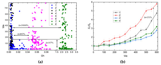 Figure 11 illustrates the comparison between the experimental data and the results of studies [8,9,10] as the relative liquid surface area versus the Weber number. With an increase in the Weber number, the maximum size of a child droplet grew. This was because the increase in the number of secondary droplets resulted in higher inertia, which resisted the surface tension force. Finally, this led to a longer spreading time of a drop over the surface. The characteristics obtained by other researchers [8,9,10] differ from those presented in this study by 8% to 32%. This result illustrates the importance of further research of the drop impact on a wall in terms of developing a more informative dimensionless criterion, which would account for not only inertia and surface tension but also other factors markedly affecting the impingement characteristics. This will make it possible to develop comprehensive regime maps with an account of all the governing characteristics, namely, dimensions, temperature, thermophysical properties of a material, hydrophilicity, hydrophobicity, roughness, etc. To date, this task has not been solved and it remains urgent for the global scientific community.