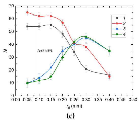 The experimental results in Figure 7c gave grounds for other conclusions. The functions N(rd) demonstrated that the surface roughness noticeably affected the number of child droplets when parent drops were small. When parent drops were comparable in size with the roughness cell, the number and size of child droplets were the same as for the impact on a smooth surface. If the cross dimension of the drop was smaller than size of the roughness cell, then the inner of the roughness cell did not affect the drop behavior. When impinging on a roughness cell, the drop broke up in the same way as during the impact on a smooth surface. In other cases, roughness did affect the characteristics of child droplets. If the parent drop partially falls into a roughness cell and partially on the edge of a roughness element, the drop interacts with the surface in the same way as with a metal mesh.