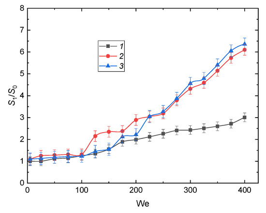 Figure 11 illustrates significant differences in the ratios S1/S0 in the case of impinging drops with different initial volumes. In particular, we performed experiments with a single large drop and three smaller ones. The total volume of the three drops equaled that of the single one. The growth of S1/S0 in the tests with three drops was noticeably higher. Thus, a pre-breakup and further impact on a wall could provide a strong increase in S1/S0. If we compare S1/S0 in the experiments with two or three drops of equal size, the number of the parent drops was of no importance when We exceeded 200 (see Figure 12). Thus, only the size of each drop and, consequently, its volume plays an important role. This result indicates that the experimental findings can be used to predict the breakup of a group of drops and even aerosols. When the Weber number was lower than 200, both the initial volume and number of drops played an important role (Figure 13) because the inertial force did not dominate as much as the surface tension and viscosity. In such conditions, the primary and secondary atomization systems [24,25,26] will be more difficult to adjust because S1/S0 will change considerably if almost any of the aerosol parameters is varied. By using a group of the parameters, namely, size, velocity, and drop concentration in a gaseous environment, we could increase the liquid surface area could by 2–25 times after impingement (Figure 13).