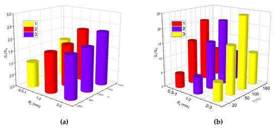 S1/S0 vs. Rd vs. ɑd (a); S1/S0 vs. Rd vs. T (b): 1—Rd = 0.5–1 mm; 2—Rd = 1–2 mm; 3—Rd = 2–3 mm.