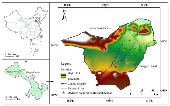 The study area is located at the Drylands Salinization Station affiliated to the Northwest Institute of Eco-Environment and Resources, Chinese Academy of Sciences, China, which is located in the low reaches of the Shiyang River (N 39°02′38″, E 103°36′36″) (Figure 1).