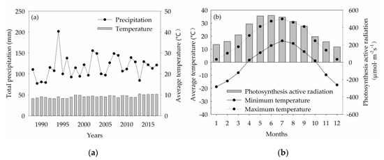 The characteristics of precipitation, temperature and photosynthesis active radiation (from meteorological data in the Drylands Salinization Station). (a) total precipitation amount and average temperature per year, (b) average temperature and photosynthesis active radiation per month.