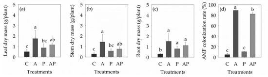 Leaf and stem dry masses in the AMF treatment and co-microbial treatment were markedly higher than those in the control (Figure 3a,b). Microbial inoculations significantly increased root dry mass when compared with the control (Figure 3c). AMF colonization rates ranged from 5% in non-inoculated plants to 89.2% in single AMF-inoculated plants, and there are also significant differences between the three microbial treatments (Figure 3d).