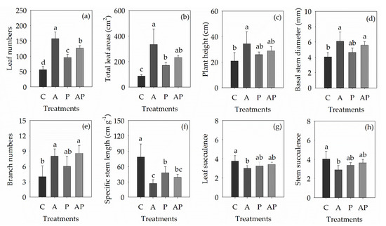 Effects of Glomus mosseae and Bacillus amyloliquefaciens on aboveground organ morphological characteristics of Elaeagnus angustifolia L. seedlings in saline soils. Values are the means ± standard deviation of five replicates. Value sharing the different letters indicate significant differences between treatments at the 5% level (Tukey’s t-test). C: Control, A: AMF (Glomus mosseae) treatment, P: PGPR (Bacillus amyloliquefaciens) treatment, AP: AMF + PGPR treatment. (a) Leaf numbers, (b) total leaf areas, (c) plant height, (d) basal stem diameter, (e) branch numbers, (f) specific stem length, (g) leaf succulence, (h) stem succulence.