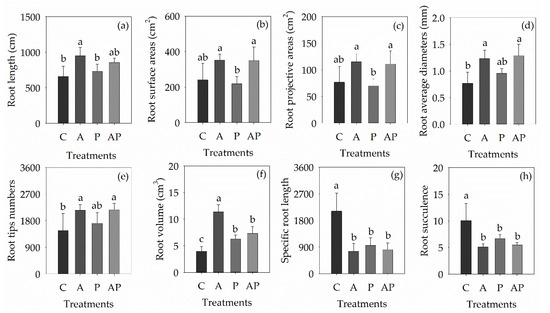 Effects of Glomus mosseae and Bacillus amyloliquefaciens on root morphological characteristics of Elaeagnus angustifolia L. seedlings in saline soils. Values are the means ± standard deviation of five replicates. Value sharing the different letters indicate significant differences between treatments at the 5% level (Tukey’s t-test). C: Control, A: AMF (Glomus mosseae) treatment, P: PGPR (Bacillus amyloliquefaciens) treatment, AP: AMF + PGPR treatment. (a) root length, (b) root surface areas, (c) root projective areas, (d) root average diameters, (e) root tips numbers, (f) root volume, (g) specific root length, (h) root succulence.