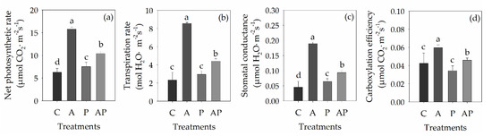 Effects of Glomus mosseae and Bacillus amyloliquefaciens on photosynthetic parameters of Elaeagnus angustifolia L. seedlings in saline soils. Values are the means ± standard deviation of five replicates. Value sharing the different letters indicate significant differences between treatments at the 5% level (Tukey’s t-test). C: Control, A: AMF (Glomus mosseae) treatment, P: PGPR (Bacillus amyloliquefaciens) treatment, AP: AMF + PGPR treatment. (a) net photosynthetic rate, (b) transpiration rate, (c) stomatal conductance, (d) carboxylation efficiency.