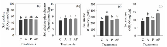 Effects of Glomus mosseae and Bacillus amyloliquefaciens on photosynthetic parameters of Elaeagnus angustifolia L. seedlings in saline soils. Values are the means ± standard deviation of three replicates. Value sharing the different letters indicate significant differences between treatments at the 5% level (Tukey’s t-test). C: Control, A: AMF (Glomus mosseae) treatment, P: PGPR (Bacillus amyloliquefaciens) treatment, AP: AMF + PGPR treatment. (a) soil catalase, (b) soil alkaline phosphatase, (c) soil urease, (d) soil sucrase.