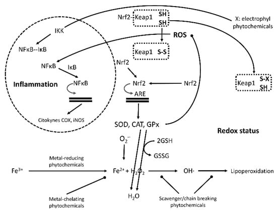 It is well-known that cysteine reduced form (SH) redox status has a primary role in the nuclear factor-erythroid 2-related factor 2 (Nfr2)/ARE pathway (Figure 3). Under physiological conditions, Nfr2 is bound to the kelch-like ECH-associated protein-1 (Keap1) and, thereby, sequestered in the cytoplasm, whereas, when under conditions of oxidative stress, Nfr2 dissociates from Keap1, translocating to the nucleus and inducing antioxidant enzyme transcription. The cysteine residues on Keap1, which are ultrasensitive to electrophiles, are critically important for Nrf2 binding. Antioxidants with catechol and electrophilic moieties induce Nrf2-mediated gene expression in antioxidant enzymes acting as pro-oxidants rather than antioxidants [77]. This effect is well-known for green tea catechins [78], but also other bioactive phytochemicals, like triterpenoids, caffeic acid, and isothiocyanates (the breakdown products of glucosinolates), which can induce the Nrf2 pathway, acting on cysteine residues of Keap1 [75,76,79,80,81].