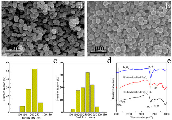 SEM images of PEI-functionalized Fe3O4 MNPs (a) and pure Fe3O4 MNPs (b), size distributions of PEI-functionalized Fe3O4 MNPs (c), and pure Fe3O4 MNPs (d), FTIR spectra of pure Fe3O4 MNPs, as well as PEI-functionalized Fe3O4 MNPs before and after Pb(II) adsorption (e).