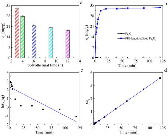 Effect of solvothermal reaction time on the adsorbing capacity (a), effect of adsorption time on adsorbing capacity (b), and fitting of Pb(II) adsorption kinetics using pseudo first-order model (c) and pseudo second-order model (d).