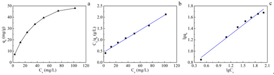 Figure 3a shows the Pb(II) adsorption isotherm at 25 °C. The adsorbing capacity was continually enhanced with increasing initial Pb(II) concentration over the studied range. In this study, Langmuir and Freundlich isothermal models were applied to simulate the adsorbing isotherms; theoretically, the former is used to describe a monolayer adsorption process, whereas the latter is applied to depict a multilayer adsorption process [5]. The Langmuir and Freundlich models are given in Equations (3) and (4), respectively.